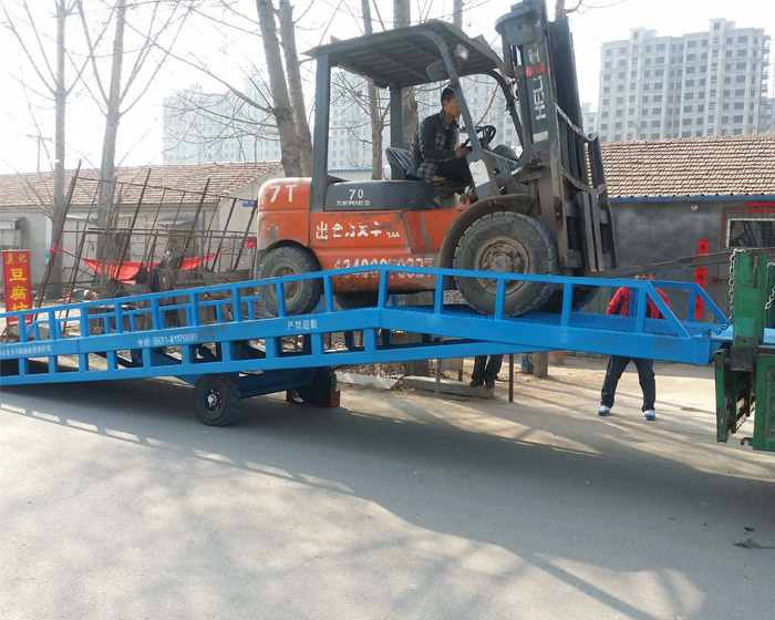 13165134678移動登車橋是與叉車配合使用的貨物裝卸輔助設備。有了它,叉車能直接從地面駛入汽車車廂內部進行批量裝卸作業。移動登車橋采用人工液壓動力,不需接動力電源,只需單人操作,可實現貨物的快速裝卸。它可使企業減少大量勞動力,成倍提高裝卸作業效率,加快貨物流通速度,獲取更大經濟效益。移動登車橋用于郵政、工廠等有站臺的倉庫、貨廠等大噸位批量裝車,具有效率高等特點。DCQ型為手搖變幅式,用手搖泵操作,不用電源就可使橋板實現變幅;廣泛用于無裝卸設備和裝卸貨臺的流動裝卸場所;是一種省時、省地、解決高位差作業的高效物流機械。