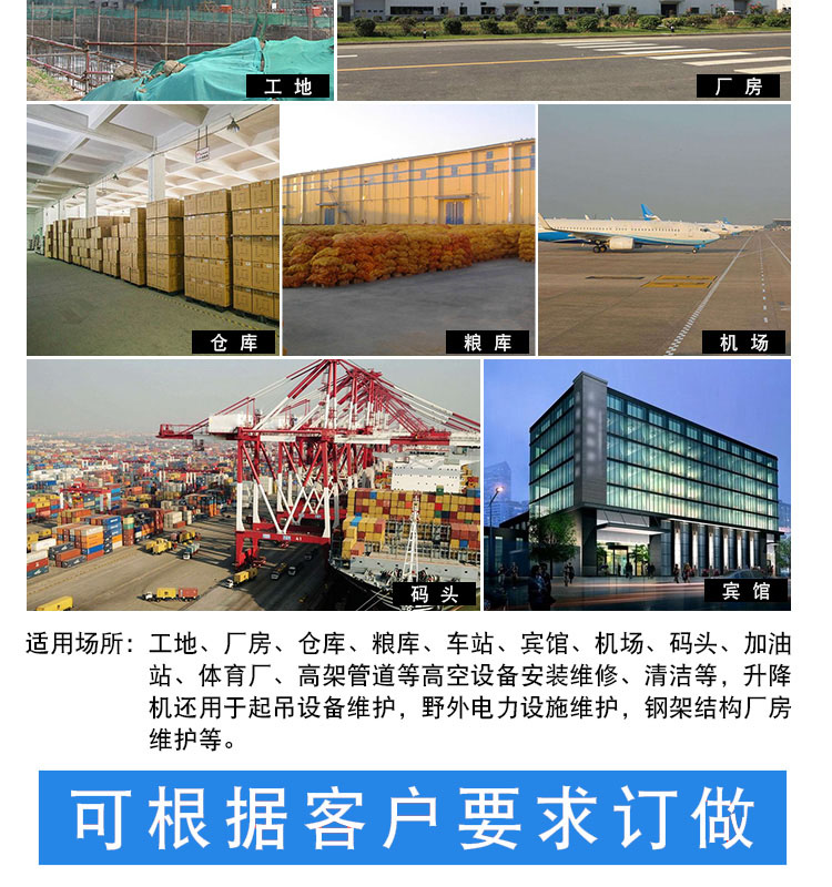 主要用于需要跨越設備及其他安裝在地面的障礙物的維修年業。更加清潔和安靜得操作特點。設備由在標準電插座上可以再充電的高效能電池組提供動力。所有型號可以全高度移動。良好的操作性能,較窄的底盤寬度有利于設備進入狹小的工業通道和擁擠的工作區域作業。